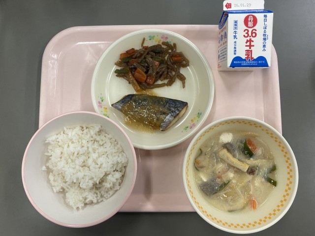 麦ごはん、鰆のごま味噌だれ、突きこんにゃくの炒り煮、呉汁、牛乳です。