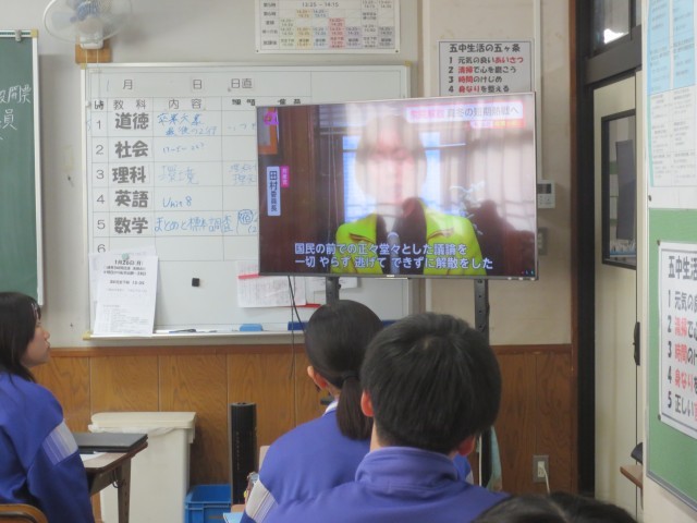 34社会です。衆議院解散を受け、現在の政党の党首はどんな政策を打ち出しているのか、動画を視聴しています。政党ごとの政策を比べることで、政治が私たちの生活に関わっていることを実感しています。