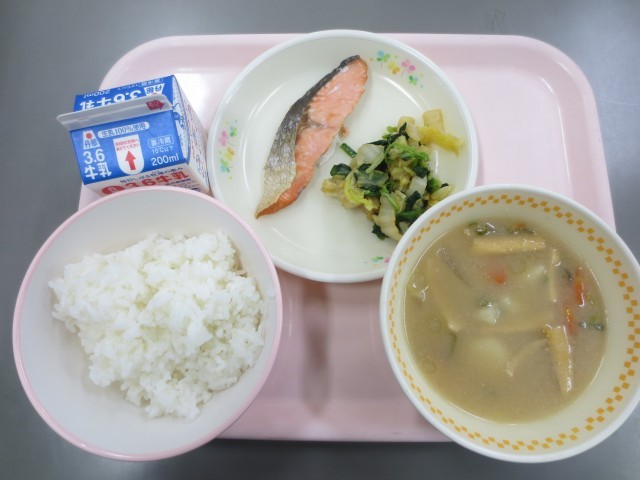 今日の給食は、ごはん、牛乳、焼き塩鮭、白菜のおひたし、すいとん汁です。今日の献立は、明治22年学校給食始まりをイメージした献立となっています。おいしくいただきます。