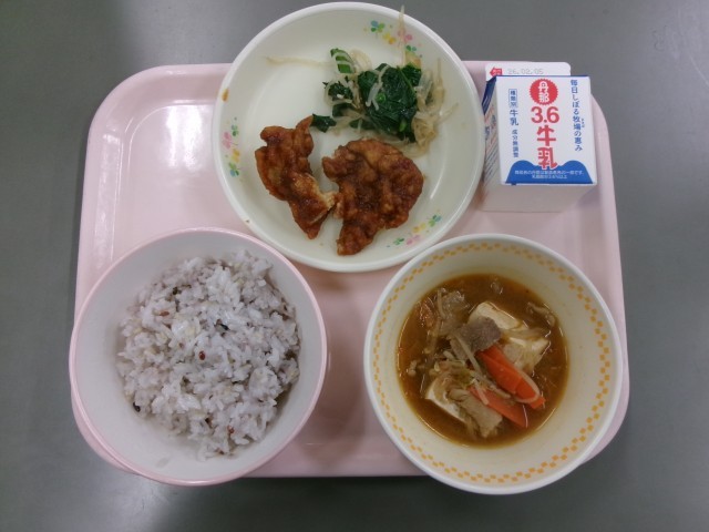 雑穀ごはん、ヤンニョムチキン、スンドゥブチゲ、野菜のナムル、牛乳 です。