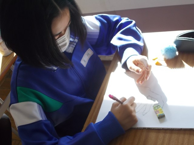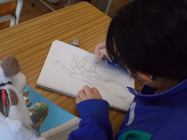 12の美術の様子です。手のデッサンを行っています。じっと見つめて、関節や肉のつき方を上手に表現しています。