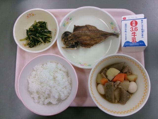 ごはん、アジの干物の素揚げ、葉大根の炒め物、しぞ~かおでん、牛乳 です。