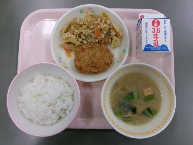 セルフとんかつ、玉ねぎと生揚げの味噌汁、牛乳
