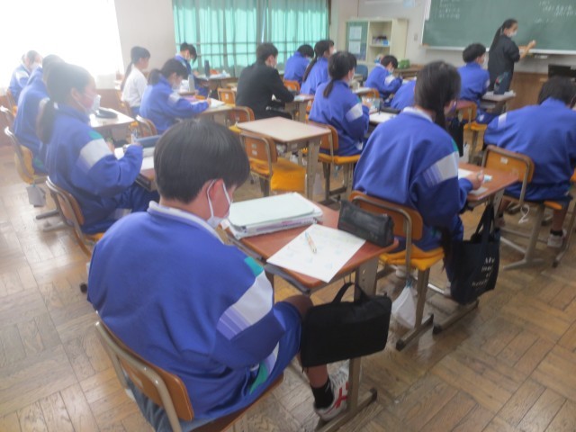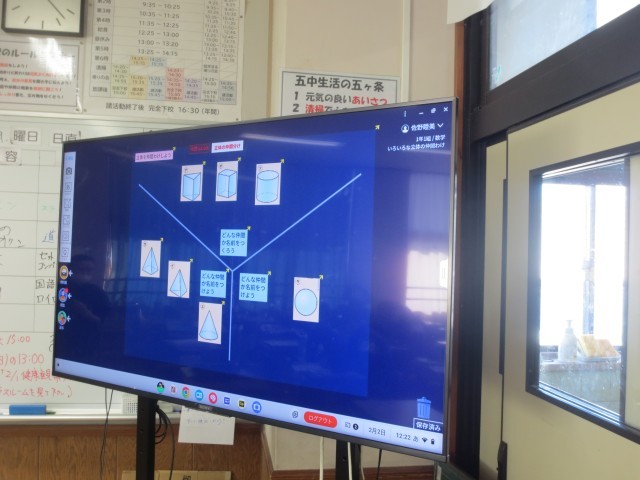 11数学では、数学の授業では、円錐や円柱などの立体について学習しました。ロイロノートを活用し、それぞれの立体の特徴に着目しながら分類する活動に取り組んでいました。