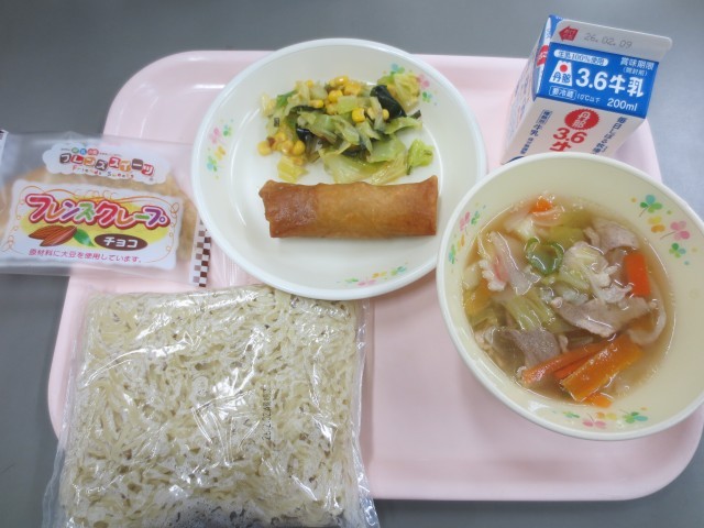 今日の給食は、中華麺、牛乳、塩ラーメンスープ、春巻き、海藻サラダ、チョコクレープです。明日2月3日(火)と2月4日(水)は、給食がありません。お弁当のご準備をお願いいたします。