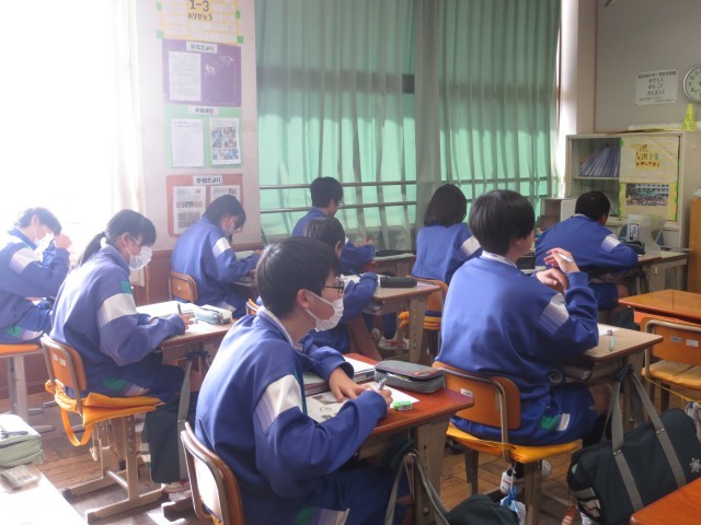 13数学では、1年3組の数学では、「ねじれの関係」について、動く映像を見ながら学習しています。2本の直線が空間の中でどのような位置関係にあると「ねじれの関係」になるのかを、具体的な場面を通して確認しました。