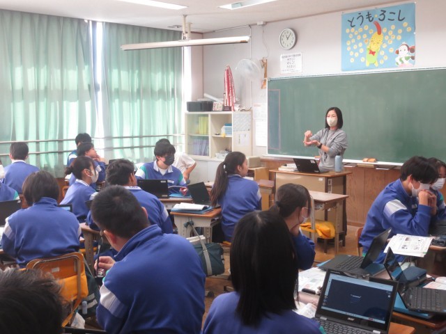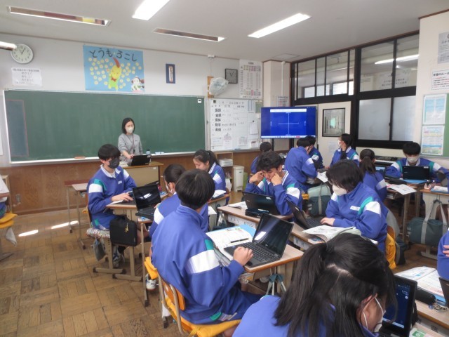33保健では、昨日の教職員研修でも活用したロイロノートのシンキングツール「座標軸」を使って、「環境と健康」について整理しました。自分の考えを座標軸上に配置し、可視化することで、環境と健康の関係を多面的に捉えることができました。