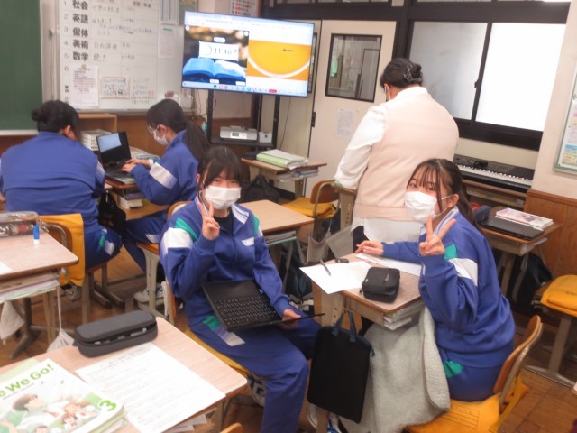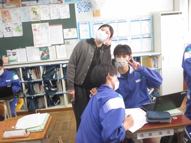 33英語の時間では、英語で自分のモットーを作ろうという活動を行っています。教科担任の先生に加え、ALT・言語サポートの先生・担任の先生が参加し、温かい雰囲気で授業が行われています。