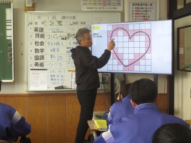 21技術では、2進法について学習しています。白いところを「0」、黒いところを「1」として考えてみようという声かけをもとに、「この2進法で、これからどんなことができるのだろうか」と予想を立てながら作業を進めていました。情報機器の仕組みとつながる学びとして、興味をもって取り組む姿が見られました。