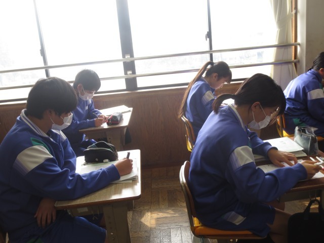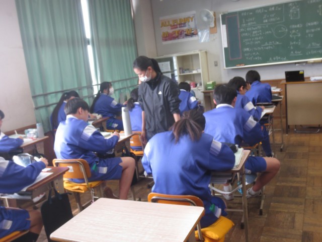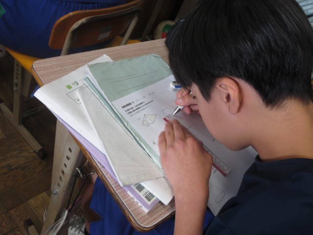 11数学では、空間図形の学習を行っています。「今までの学習をつなげていければできるよ。」という声かけに、子供たちもこれまで学んできた内容を思い出しながら、図を描いたり、考えを言葉で説明したりして、粘り強く問題に取り組む姿が見られました。