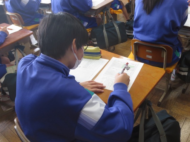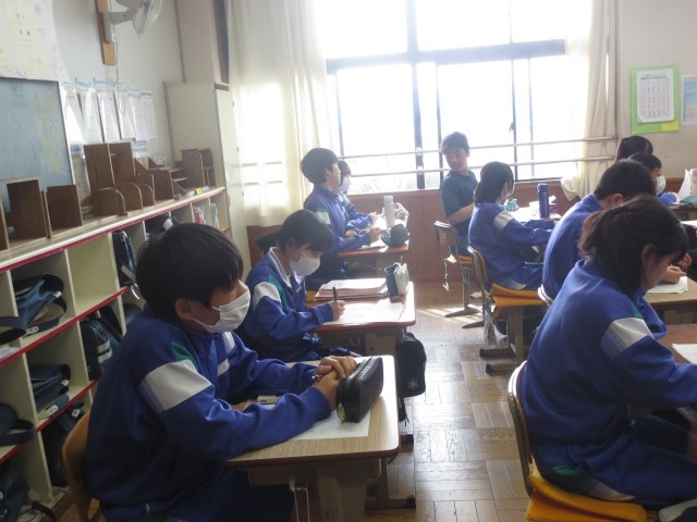 14国語では、国語では、学年末テストの振り返りを行っています。国語のテストで難関となりやすい作文問題について、どのように書けば自分の考えを論理的に伝えられるのかを全体で確認しました。構成の工夫や理由の示し方などを確かめながら、次につながる学びの時間となっていました。