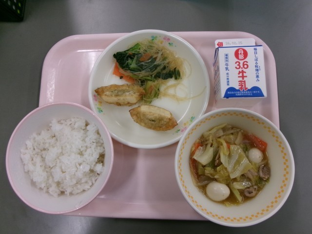 麦ごはん、中華丼、揚げ餃子、春雨の中華炒め、牛乳です。