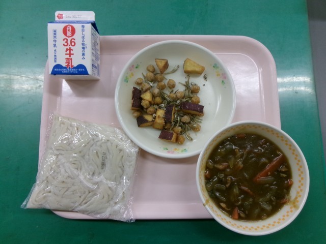 カレー南蛮、さつまいもと小魚の唐揚げ、牛乳です。