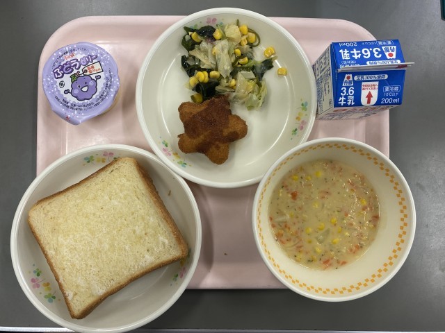 シュガートースト、星型コロッケ、コーンポタージュ、海藻サラダ、牛乳。