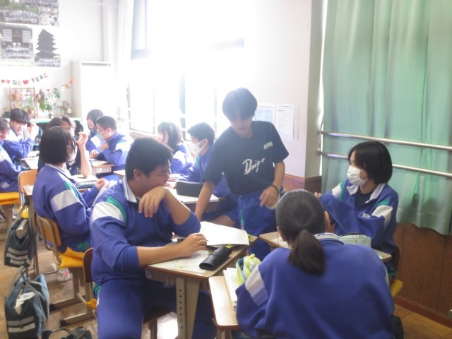 31家庭科では、調理実習で茶碗蒸しを作るため、グループで調理計画を立てています。材料の分量や手順、役割分担を話し合いながら、協力して準備を進めています。
