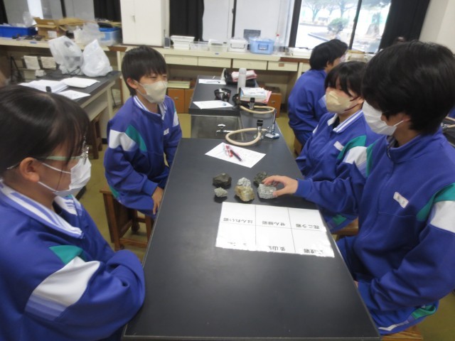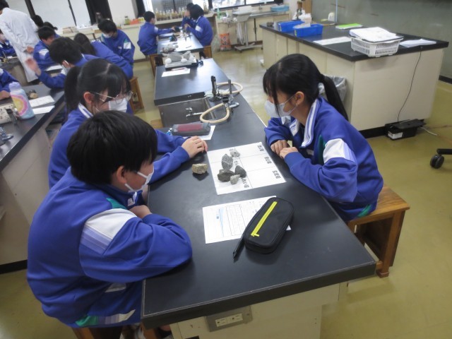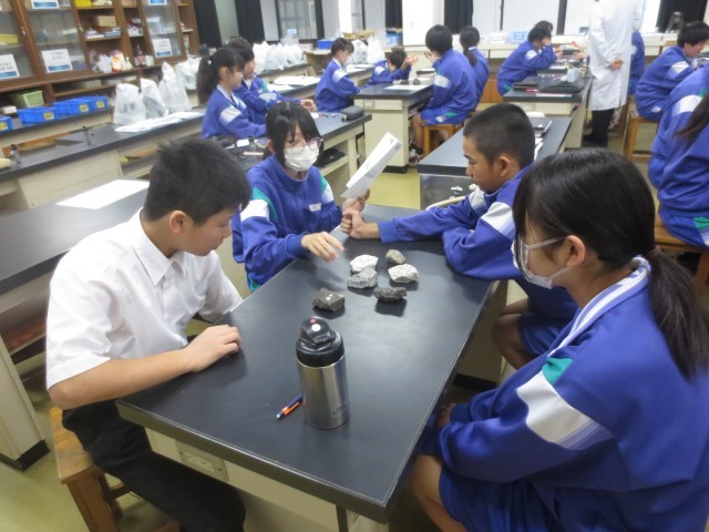 12理科では、玄武岩や安山岩などの実物の岩石を観察しながら、その特徴をもとに種類分けを行っています。実物に触れることで、教科書だけでは分からない岩石の違いを実感しながら学びを深めています。