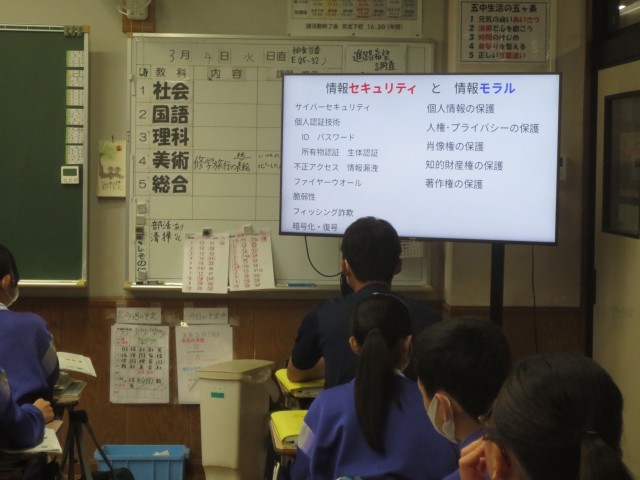 23技術では、これからのIT社会を生き抜いていく生徒にとって大切な、情報モラルや情報セキュリティについて学習しています。安全で適切な情報活用について理解を深めています。