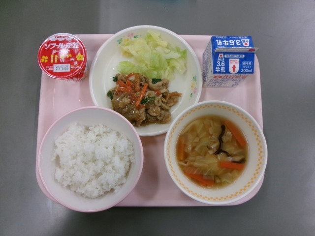 ごはん、スタミナ焼き肉、ボイルドキャベツ、ワンタンスープ、ヨーグルト、牛乳です。