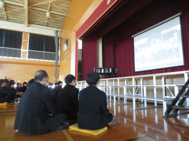 思い出のアルバムでは、1年生からの思い出の写真が紹介され、懐かしい先生方からのメッセージとともに会場は大いに盛り上がりました。その後、1・2年生の代表から3年生へ、これまでの感謝の気持ちを込めたメッセージが読み上げられ、お礼のメッセージとお花が贈られました。