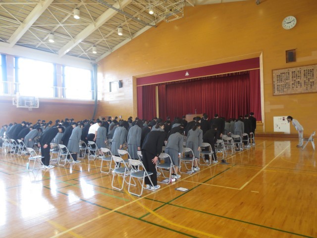 3年生は体育館で卒業式の練習を行いました。卒業式まで残すところあと2日となりました。礼や動きも少しずつそろってきており、厳かな雰囲気の中で練習に取り組んでいます。本番に向けて、3年生の表情にも引き締まった様子です。