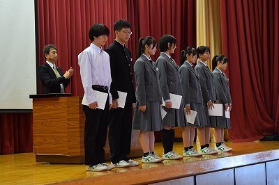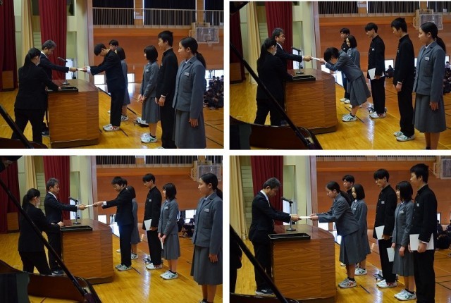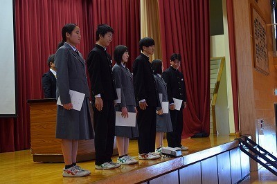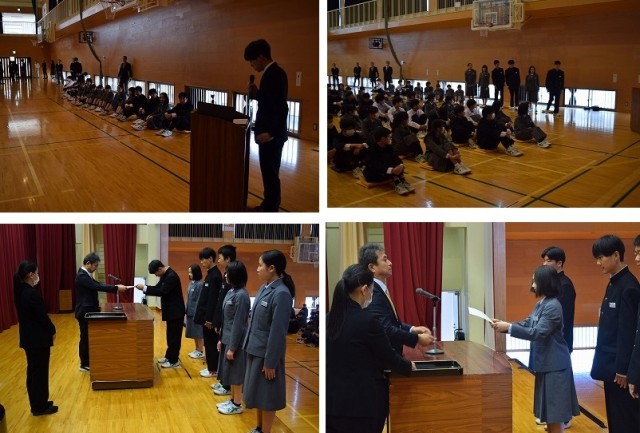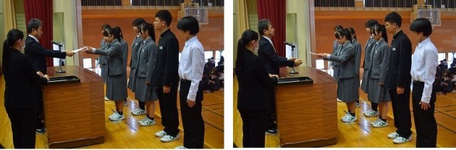 生徒会本部役員と専門委員長の任命を行いました。どの生徒も立派な態度で、やる気に満ちあふれていました。前期、よろしくお願いします。