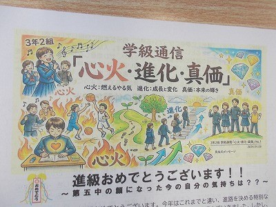 学級通信の名前「心火・進化・真価」ついて考えています。熱い思いがありますね。