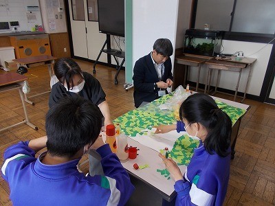 学級目標の掲示物をつくっています。丁寧に紙をはっていました。