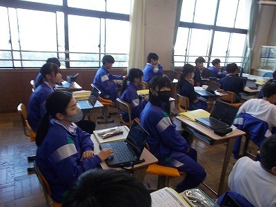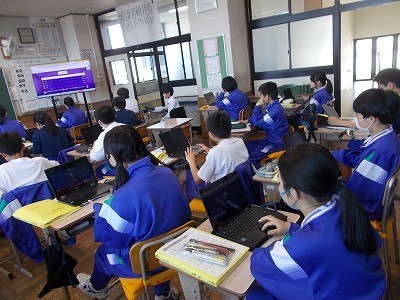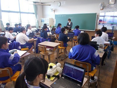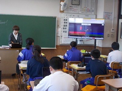 クロームブックを使って、英文をクイズ形式で答えています。みんな楽しみながら集中しています。