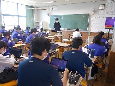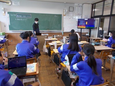 クロームブックを使って、クイズ形式で、今までの学習の確認を行っています。