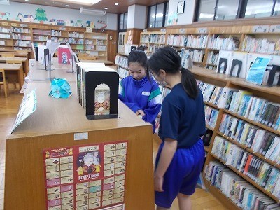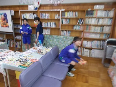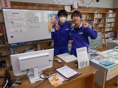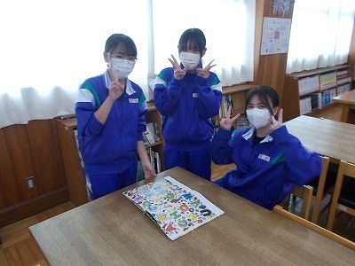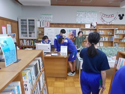 昼休みのようすです。今日は火曜日なので、図書館支援員さんが来校しています。支援員さんにどんな本がおすすめなのか教えてもらっていました。