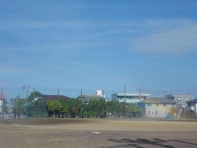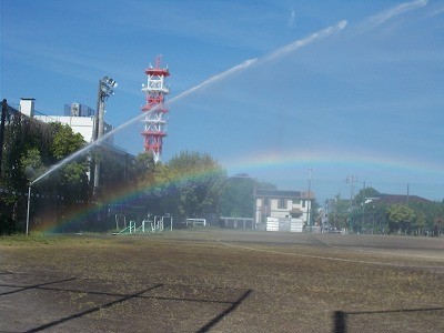 散水機からの水でグラウンドにきれいな虹ができていました。登校している生徒は、感動していました。