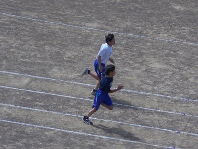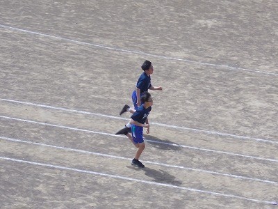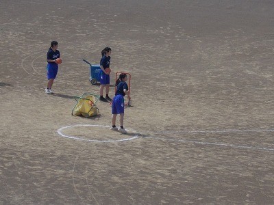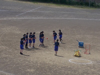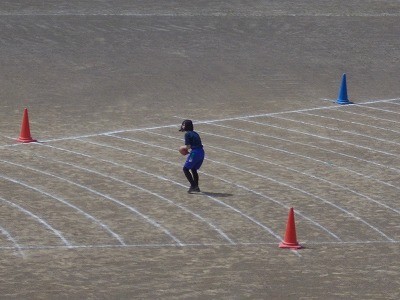 新体力テストのようすです。男女に分かれ、ハンドボール投げと50m走を行っています。