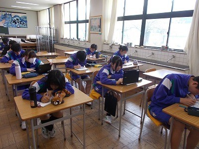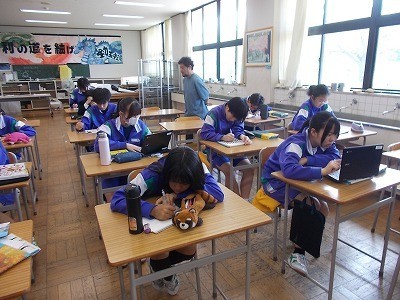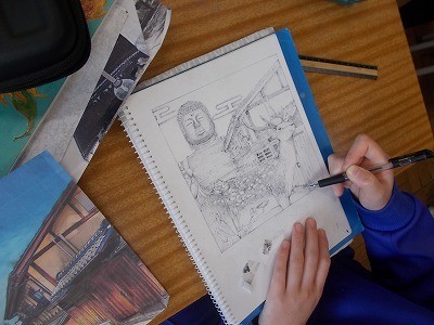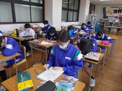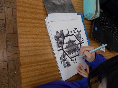 修学旅行のしおりの表紙絵を作成しています。一点一点丁寧に描いていました。