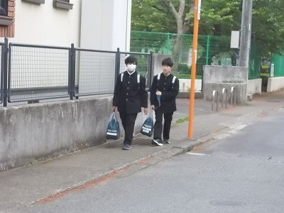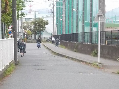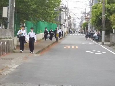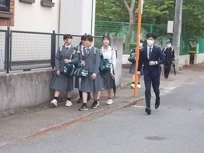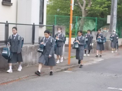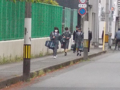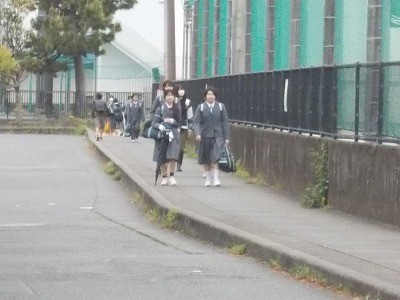 登校のようすです。今日は少し肌寒い気候です。生徒は元気に登校しています。