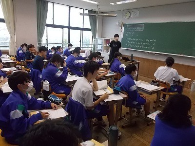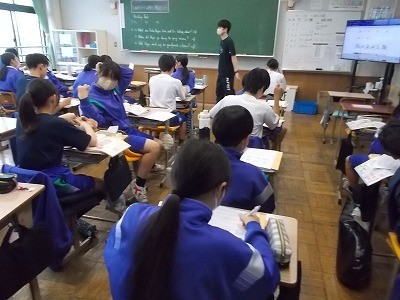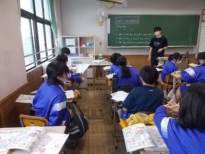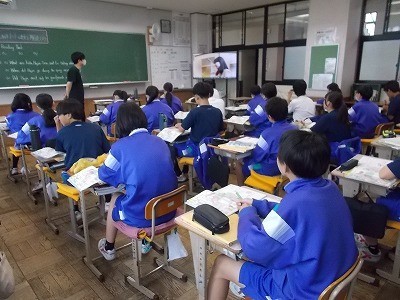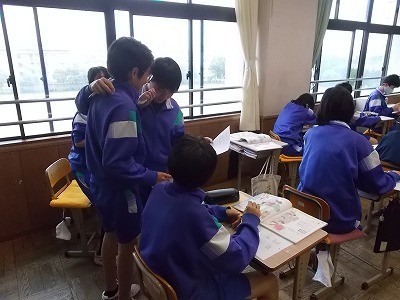 英会話を聞いて、ピクチャーカードを並び替えています。聞いた後は、お互いに確認し合っていました。