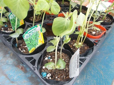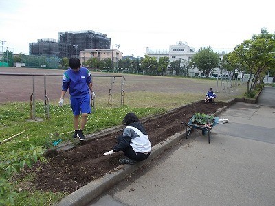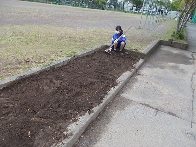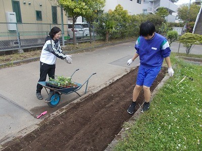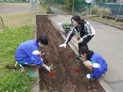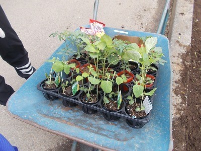 プチトマトやエダマメの苗を植えています。大きく育つように、心を込めて植えていました。