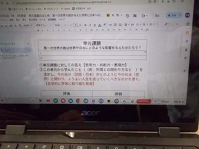第一次世界大戦は世界にどのような影響を与えたのか、資料等を活用しながら調べていました。