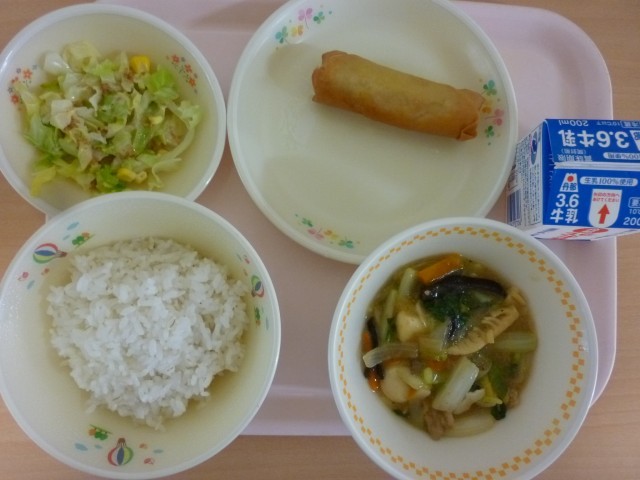 中華丼(麦ごはん) 春巻 キャベツとコーンのサラダ 牛乳