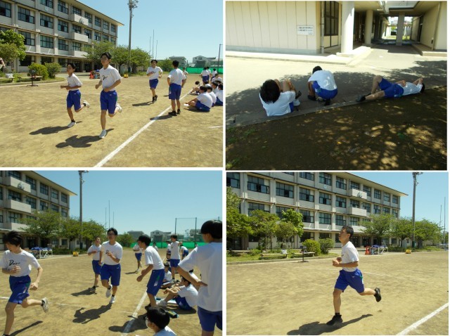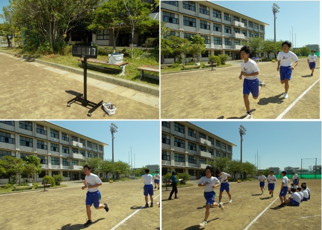 保健体育の授業です。しおさい基金で買わせていただいた、タイマーを使って1500㍍のタイムを計っています。みんな歯を食いしばって頑張っています。少しでもよい記録を目指そうという気持ちがとても素敵ですね。