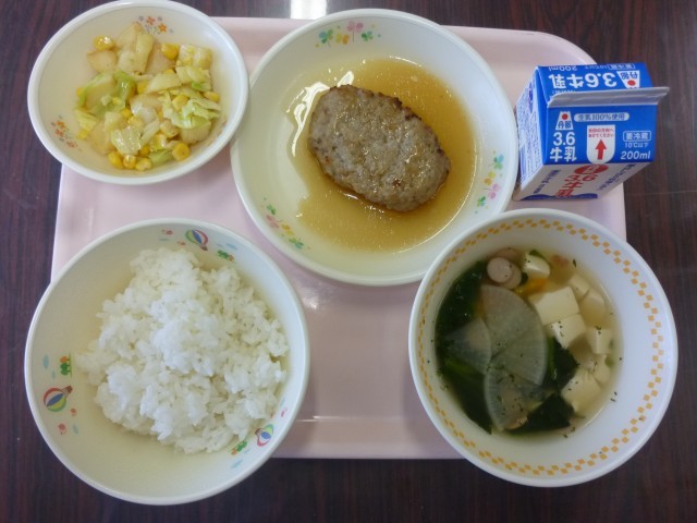 レンコンハンバーグ ポテトと野菜のソテー ウィンナーと根菜のスープ ごはん 牛乳