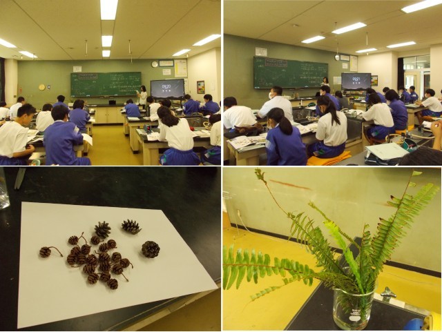 理科の授業です。松の葉の作りについて観察しています。一人一人松ぼっくりを真剣なまなざしで見つめていました。