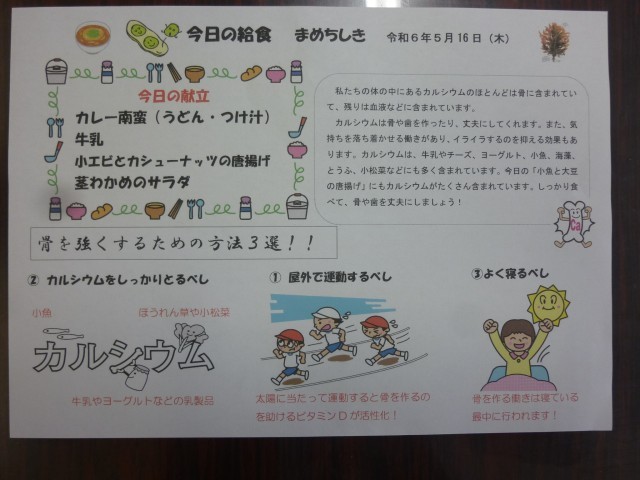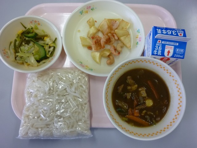 カレー南蛮うどん 小エビとカシューナッツの唐揚げ 茎とわかめのサラダ 牛乳