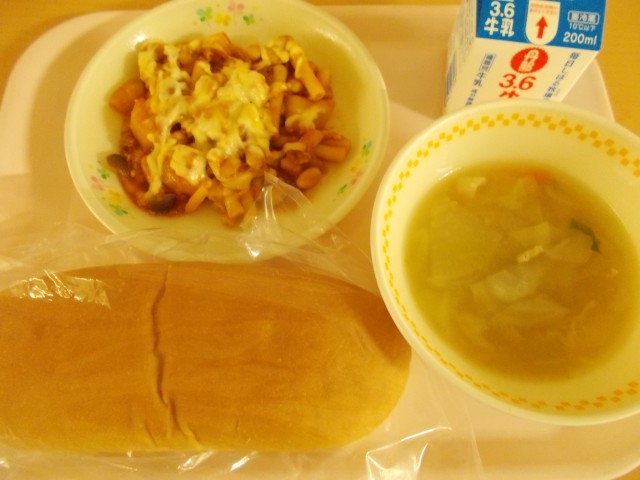 ロールパン 牛乳 ミートグラタン 鶏むね肉とキャベツのスープ いただきます。