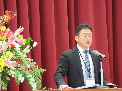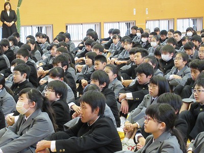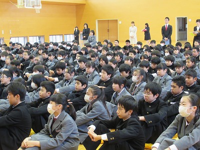 校長式辞では、まず、昨年度の震災やテロなどの暗い出来事の一方で、オリンピックやノーベル賞の受賞など明るいニュースもあり、勇気・元気・感動をもらったこと、一生懸命な姿や頑張っている姿は人に感動を与え、人を笑顔にすることができるというお話がされました。そして、新年度になり、先輩となる2・3年生に向け、「先輩」とはどのような人のことを言うのかなど、先輩としての構えの話もありました。さらに、今年度から第五校区三校合同の学校教育目標「やさしく かしこく たくましく」になることから、この言葉の意義もお話されました。同じ言葉でも小学生と中学生では受け止め方が違う。9か年の学びの中で根付くものはどのようなことかなど、かみ砕いて説いてくださいました。先生方にも目指してほしいことであり、学校全体で意識していきたいことでもあるとし、最後に、昨年度以上に他校からあこがれる第五中にしていこうというエールが送られました。