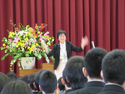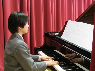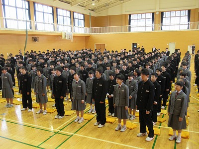 校歌斉唱の様子です。指揮は山本敦子先生、ピアノ伴奏は渡邊怜那さんです。