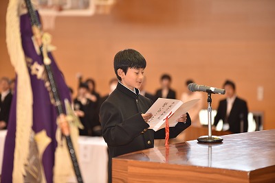 新入生代表宣言(新井智晴さん)の様子です。堂々と誓いの言葉を述べることができました。