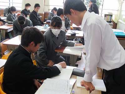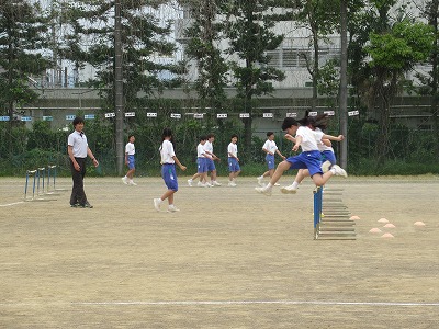 2年3組、保健体育の授業です。スピードを落とさずに、二つ目、三つ目のハードルが跳べるように練習しています。次のハードルに向けて、テンポよくいきたいところですが、苦戦している様子も見られます。一つのハードルで練習している生徒、二つで練習している生徒、三つで練習している生徒と自分の課題解決に合わせて選んでいます。