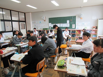 2年5組、数学の授業です。「式の利用」の学習です。今日は、文字の意味について考えていきます。「三つの連続する数の和を出す」これを受けて、まずは「式の中から法則を見つけてみると?」という課題に向き合っています。