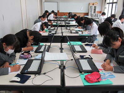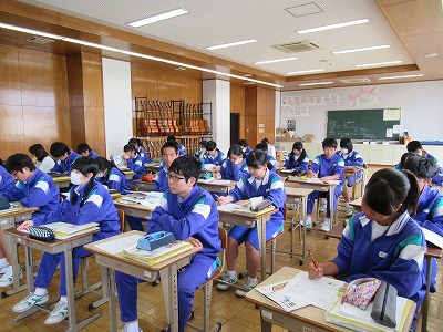 3年2組、言語読解の授業です。「沼津のよさを詳しい情報とお薦めのできるポイントを使って紹介しよう」の3時間目です。自分が収集した情報を取捨選択しながら、A4の紙面に自分なりの表現方法で沼津のよさを紹介できるようにまとめています。