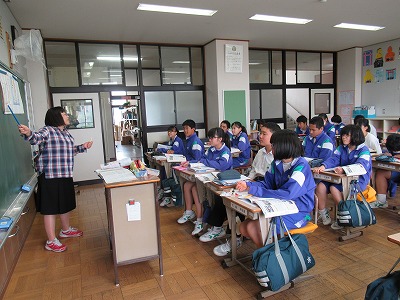 3年3組、言語英語の授業です。今日は、外国人の旅行者から行き先について尋ねられるという設定です。東海道線、駿豆線、伊東線の駅名を使いながら答えていきます。ペアで役割を交替しながら会話練習をしています。